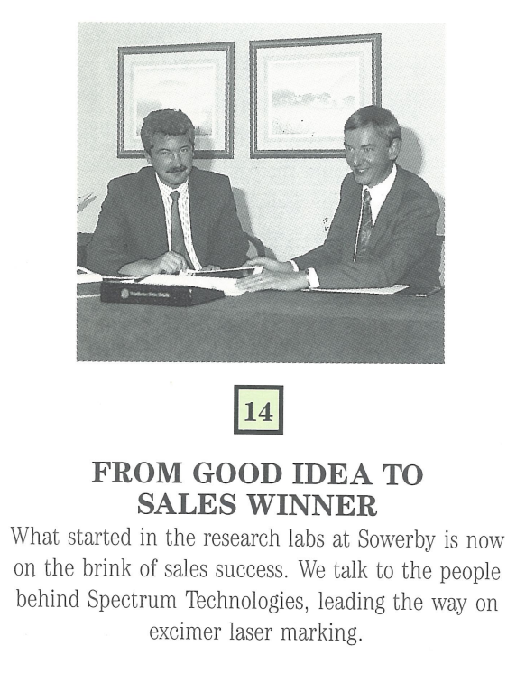 5月,美國McDonnell Douglas飛機公司向OLT提交了準分子激光打標系統的報價請求。作為研究中心的一部分,OLT無法對這樣的商業要求作出回應,總部設在加利福尼亞州的美國Vektronics公司中標。然而,行業興趣和需求的增加促進了形勢的發展,8月,英國航空航天董事會批准成立光譜科技公司,作為向BAE企業報告的全資子公司。10月,光譜科技公司成立。Peter Dickinson在其索爾比研究中心發起並領導了BAE的工業激光研究項目,他被任命為Spectrum的董事兼總經理,而企業的新項目總監理查德·胡克(Richard Hooke)則成為董事長。